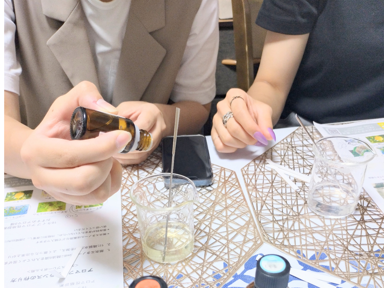 精油を使用したすっきり優しい、どなたにでも好まれる香りをお作り頂けます。(香りのブレンド法は講師が丁寧にお伝え致します。お好みの香りをお作りください。)