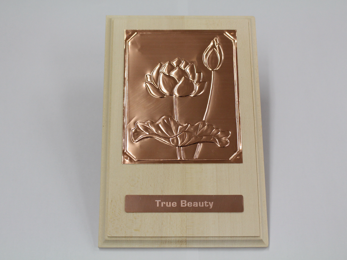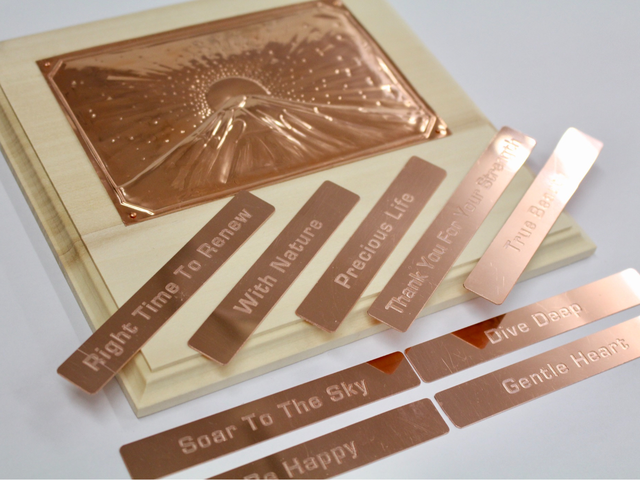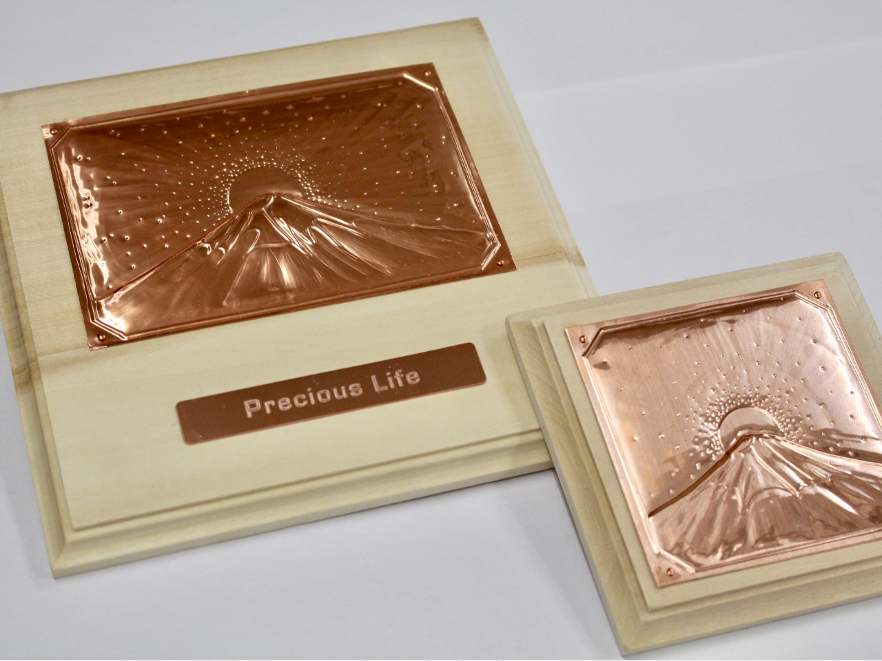 エンボッシング用の道具を使用しながら、薄い銅版に凹凸を作り出していく製作体験です。数種類の図案の中からお好きなものを選んでいただき、大きさも決めていただきます。一度に力を加えず、徐々に図案の全体を仕上げていきます。図案のエンボッシングが完成したら、背景を点や線で表現し、自由な流れや動きをつけていきます。必要であれば、図案の凹凸の裏面にレジンを流し入れ、耐久性を維持するために固めます。最後に縁取り付きの白木板に貼り付け、四方に銅の飾り釘を打って完成です。大きなサイズの場合、当方でご用意した9種類の英語のキーフレーズプレートの中から一枚選んでいただき、貼付します。