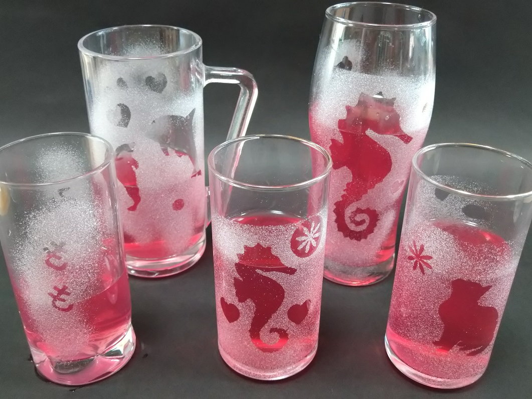 まずはグラスにシールを貼ったり、絵を描いたりしましょう。最後にエアーガン状のもので砂を吹き付けて完成!