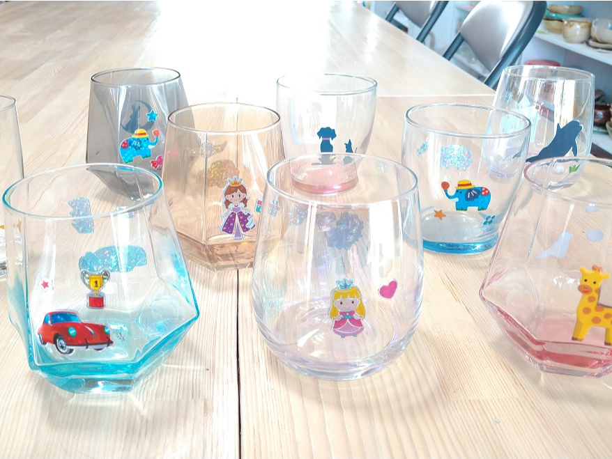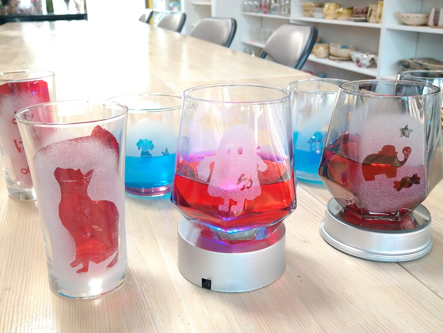 制作した当日に、グラスに飲み物をついで乾杯付き!模様がすごい綺麗に浮かび上がります! *体験で制作した作品は、その日のうちに持って帰ることができます。