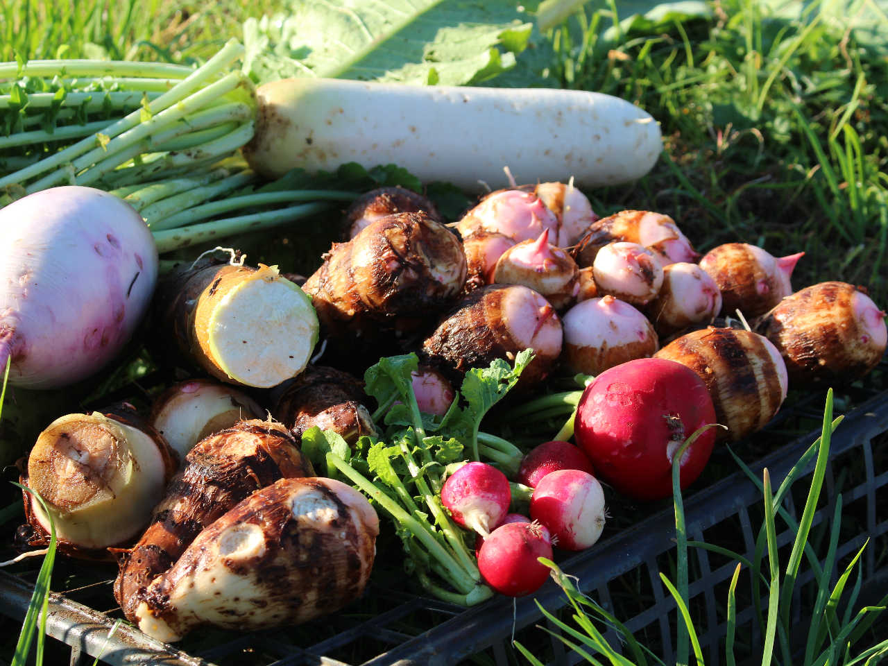 野菜・・・ 冬野菜は、大根、インゲン、ブロッコリー、春菊、ネギ、ヤーコン、里芋など