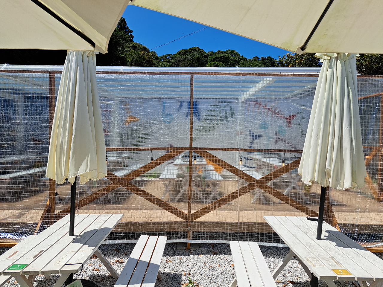 ■テラス席、BBQエリアは屋根&ビニールカーテンつき。雨でも大丈夫♪