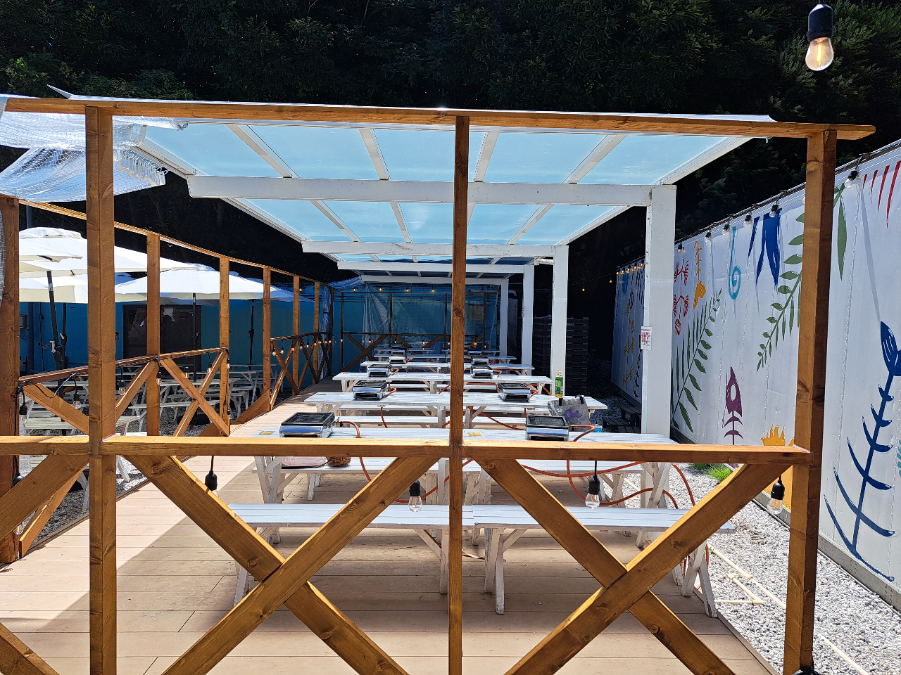 ■テラス席、BBQエリアは屋根&ビニールカーテンつき。雨でも大丈夫♪