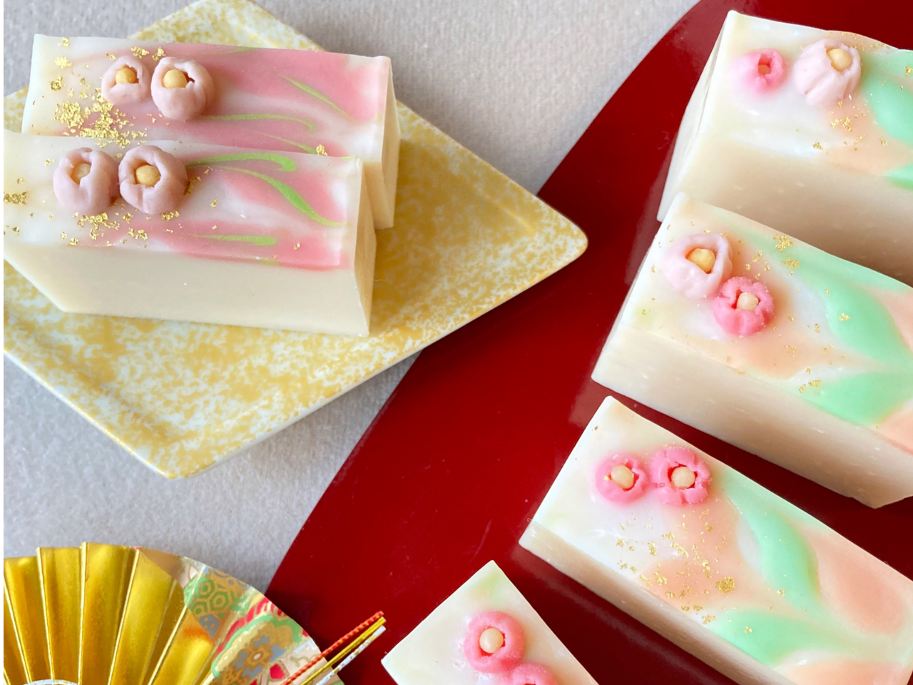 今年は山形の酒蔵の吟醸酒の酒粕を使用、シアバターとホホバオイル配合でしっとり潤う贅沢なオイルレシピです。トップには梅の花を飾り、金箔を振って華やかに春色の石けんに仕上げます。
