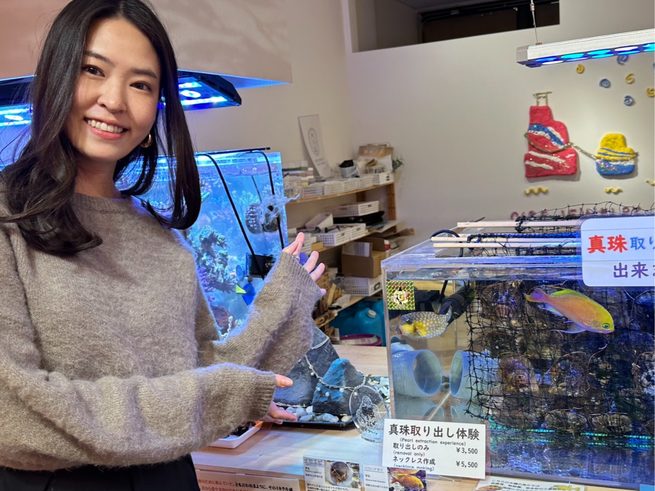 本物の生きたアコヤ貝から真珠を取り出せます。