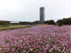 エレベーターで展望塔に上がると、花広場の地上絵を見ることができます。花広場には、春はネモフィラ、秋にはコスモスで地上絵が描かれます。地上から花広場に一面に咲くネモフィラやコスモスを見ても、地上絵には気付きません。展望塔に上がって展望室から見下ろすと、ほっこりできる地上絵を楽しむことができます。