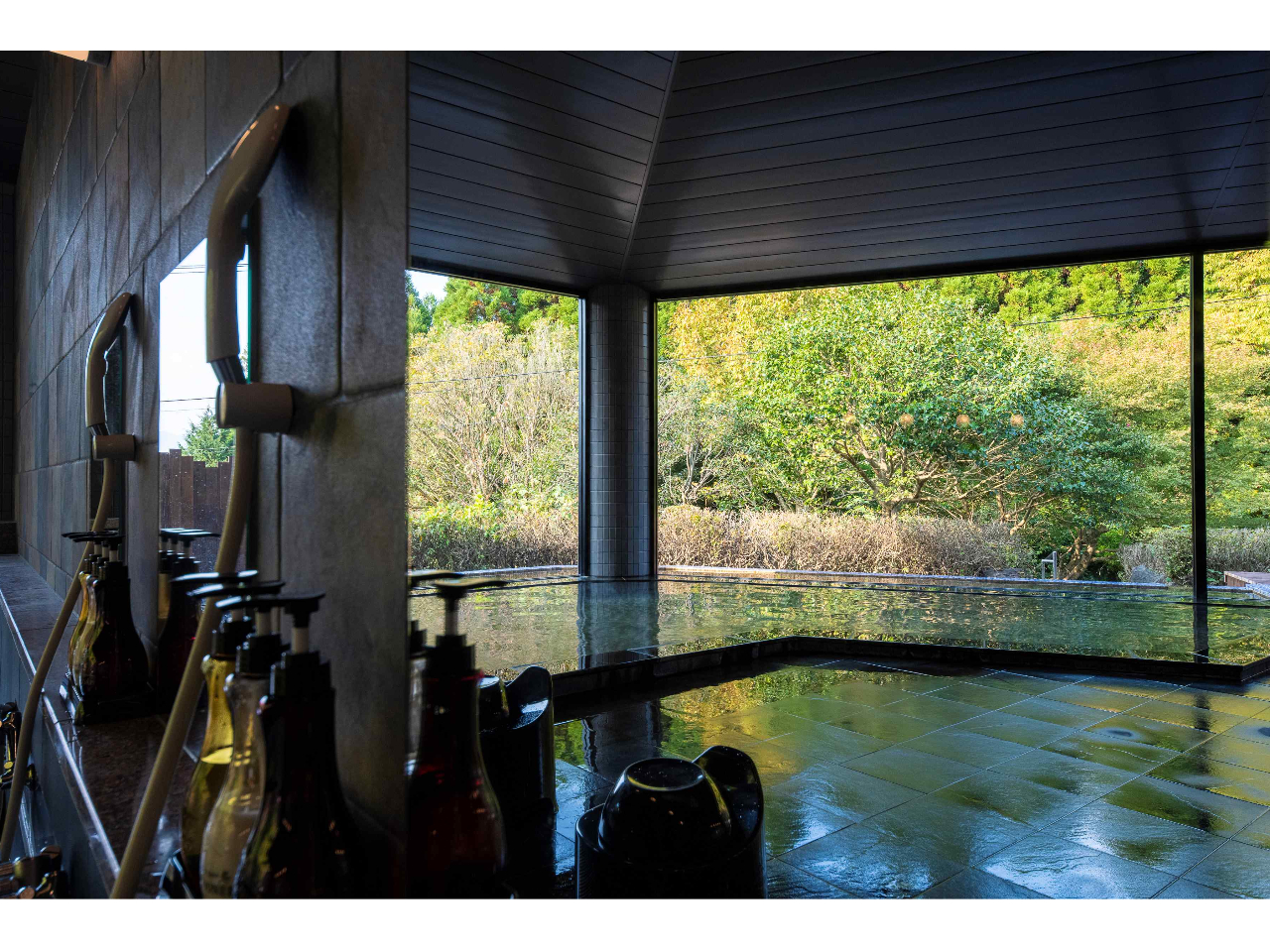南郷谷から続く稜線を見おろす開放的な総ガラス張りのデザインです。