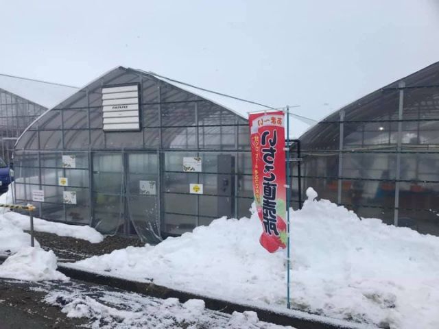 いちご農園入り口です。ビニールハウス中は雨でも雪でもいちご狩りをお楽しみいただけます。