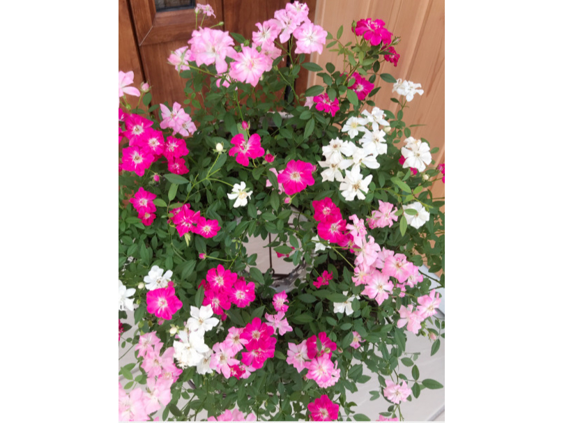 白、ライトピンク、ローズピンクの3色でれんげの花のように咲く愛らしいミニバラです。