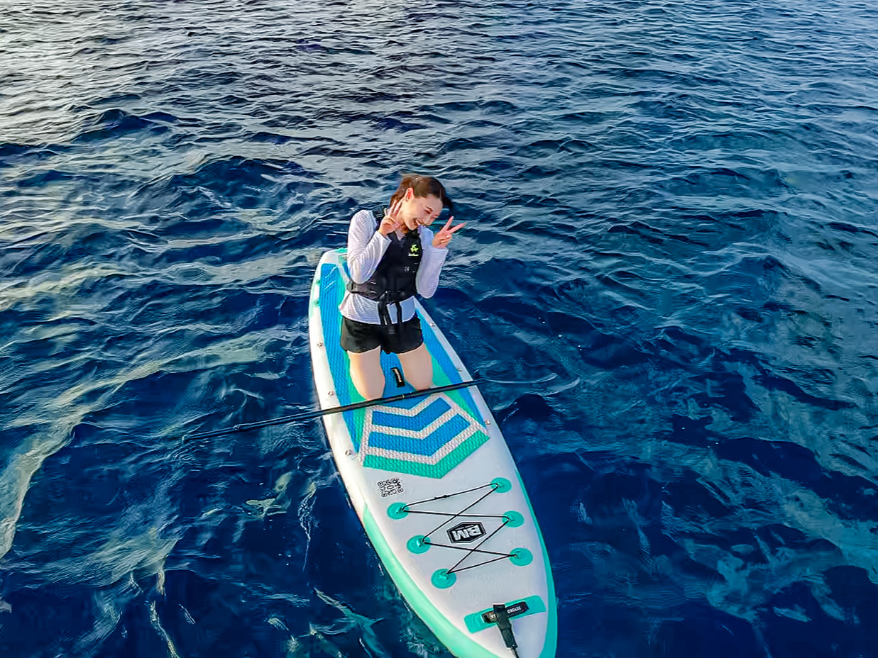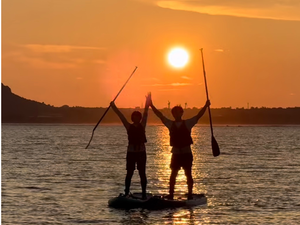 SUPを楽しんだ後、SUPの上で寝転がったり座って、