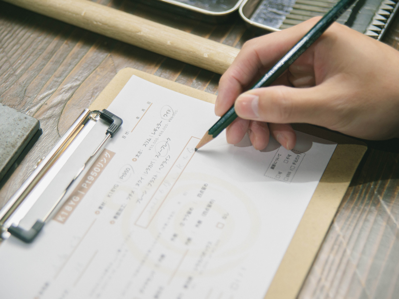 A製作するリングの内容(リングサイズ、リング幅、表面加工、文字刻印)やオプション(ダイヤモンド・誕生石の追加、ゴールドメッキの加工)についてお選びいただきます。(10分)