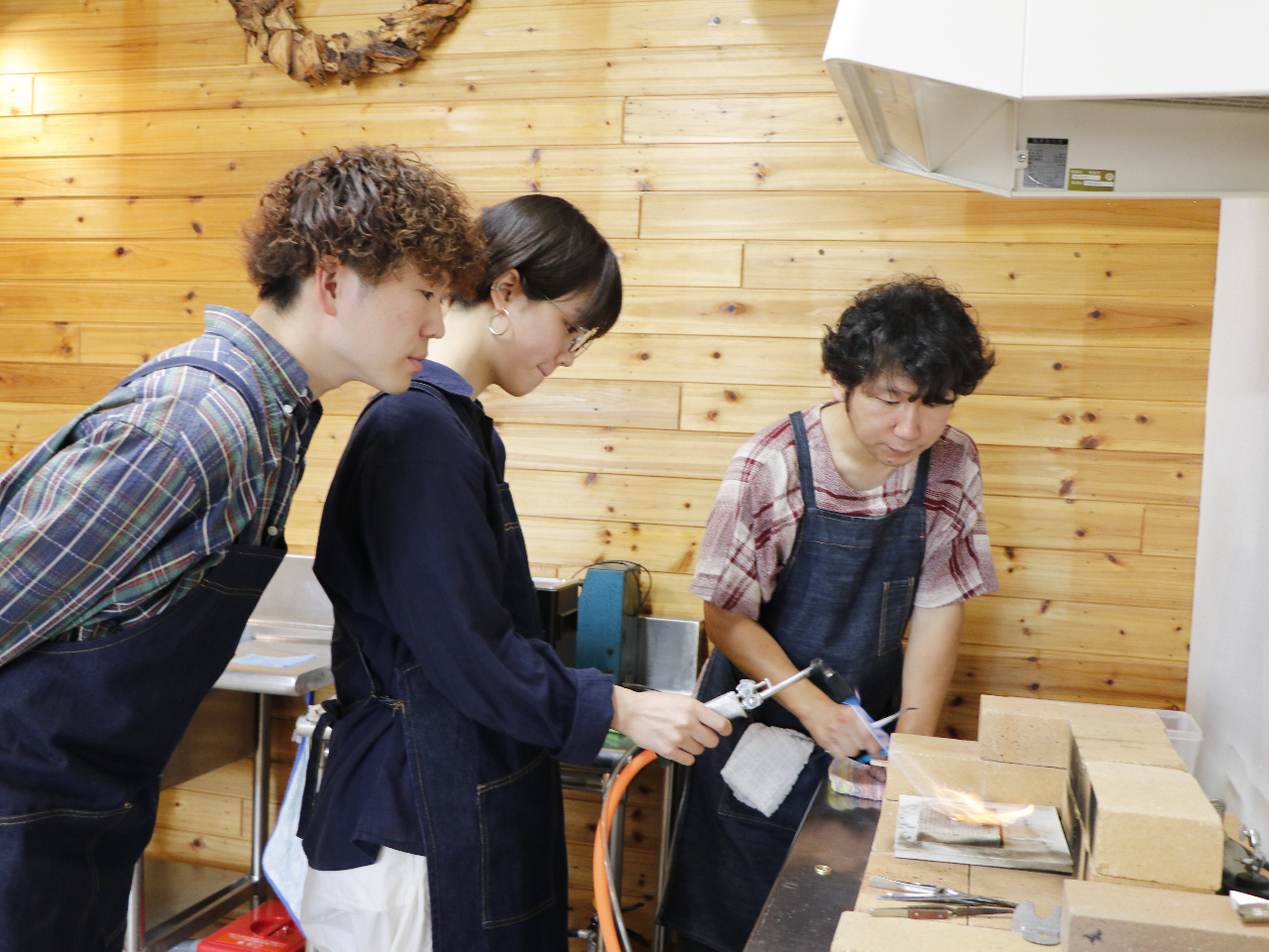 バーナーを使って、職人と同じように本格的な溶接作業を行います。シルバーの棒が指輪になる瞬間です。職人がつきっきりで作業するので、初心者の方も安心です。