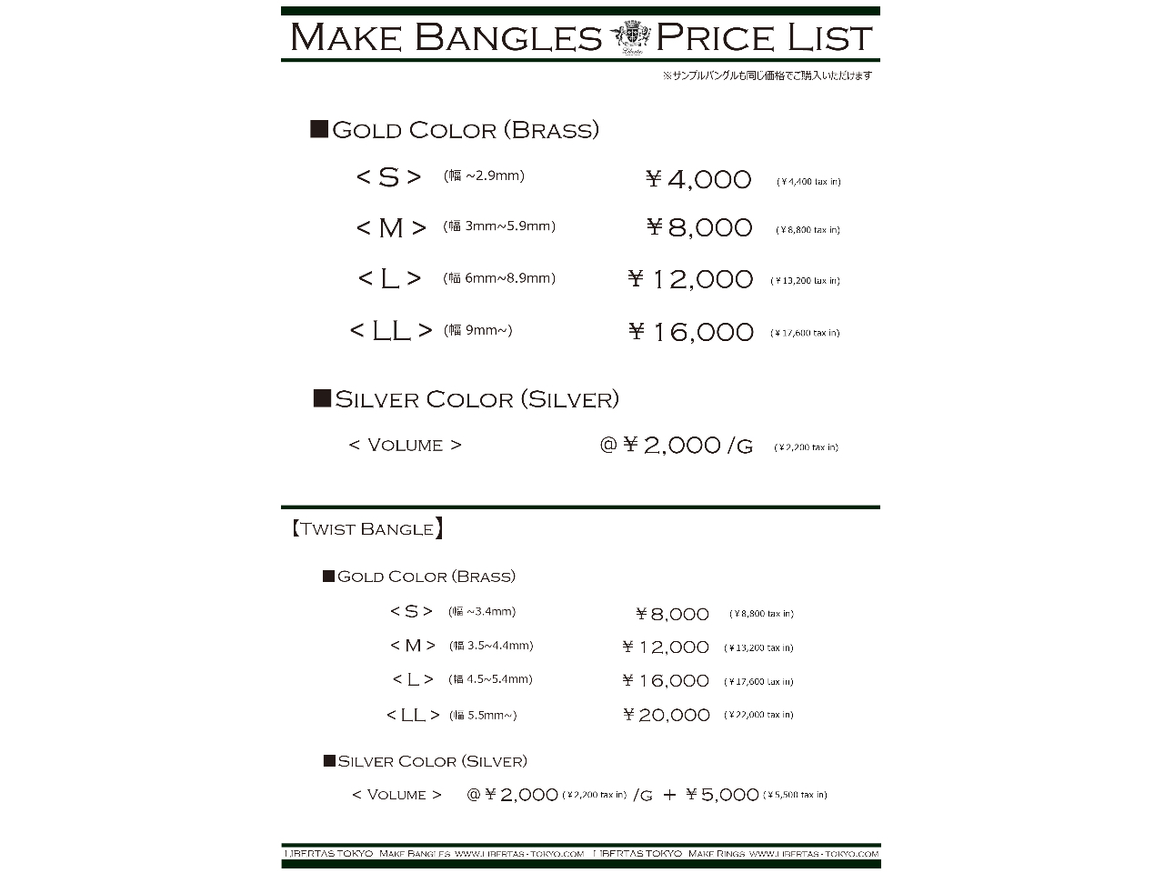 ※細身のバングルでおおよそ10,000円程度から、幅3mm〜4mm程度のサイズでおおよそ20,000円程度になります。