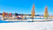 白い雪原と色とりどりの紅葉、雲ひとつない青空と鏡のような湖面、そして遠くに見える刈羽黒姫山!