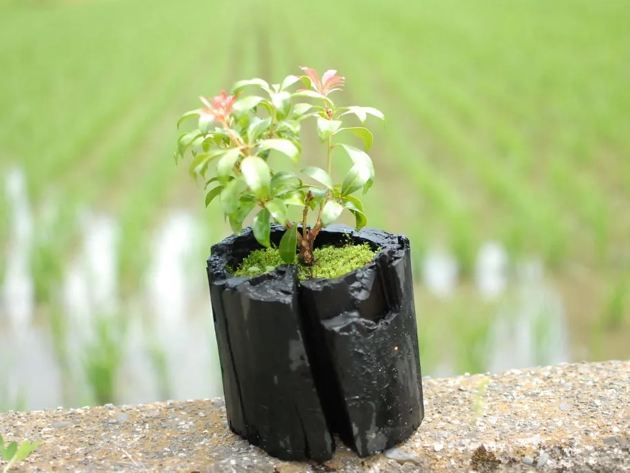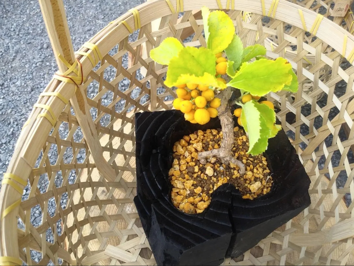 炭を器とした盆栽 炭盆(すみぼん)。