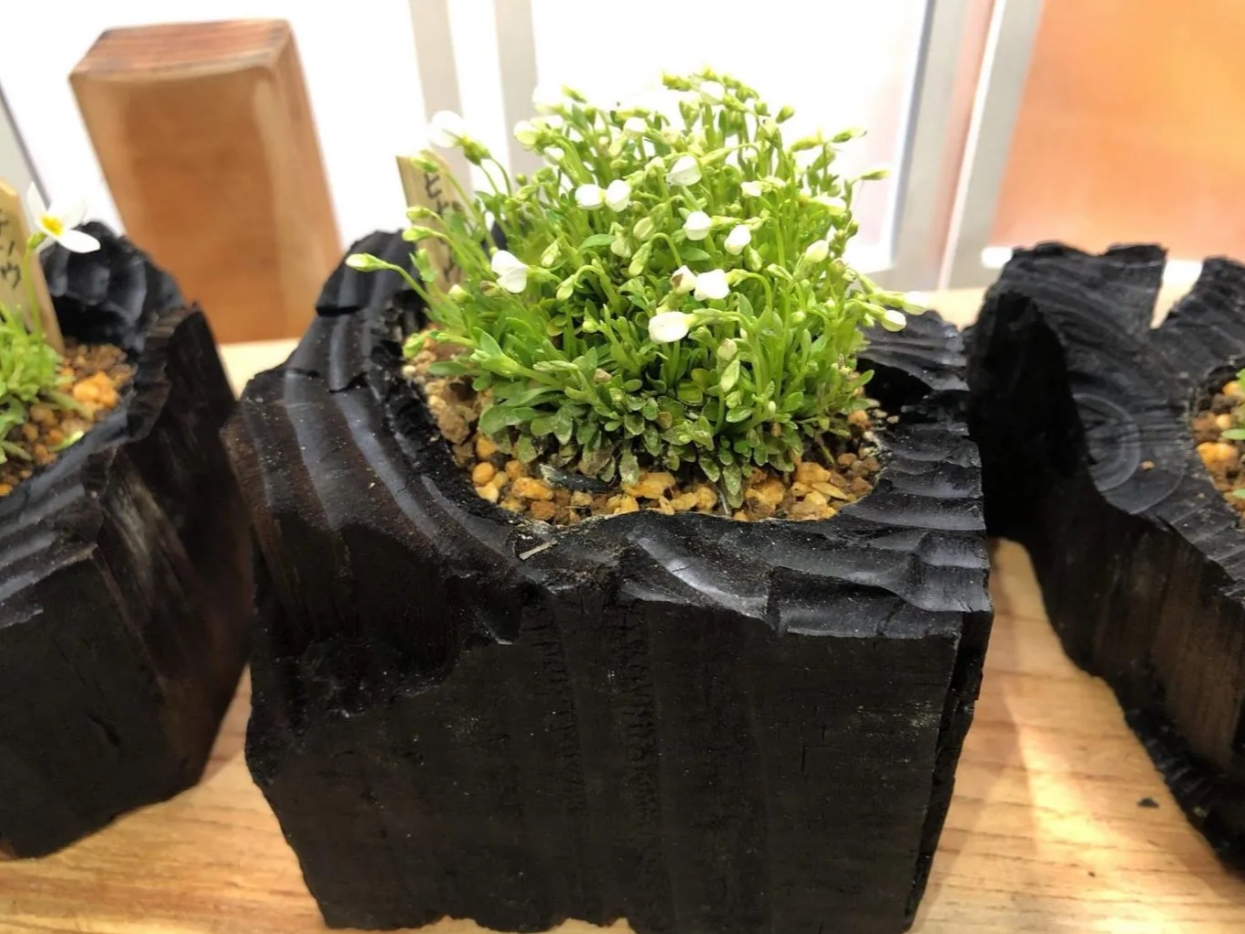 信州の小さな集落『信級(のぶしな)』の炭焼き職人が、ひとつひとつ丁寧に作り上げた炭の器に、盆栽苗や多肉植物などを植え付ける『炭盆』づくりを体験できます。