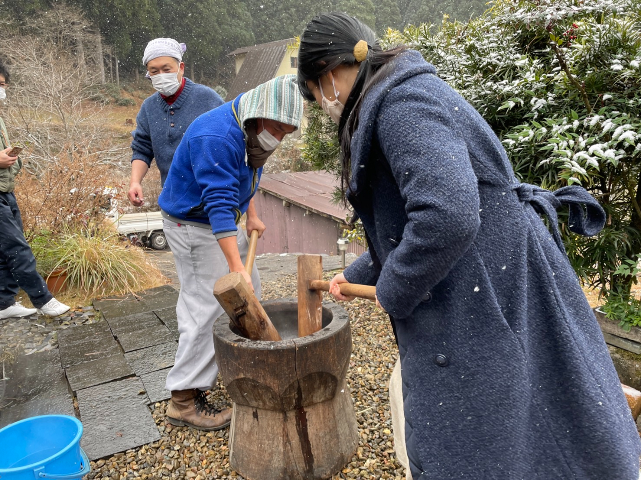雪の舞い散る中でのお餅つき体験は風情があって、寒さも忘れるほど。