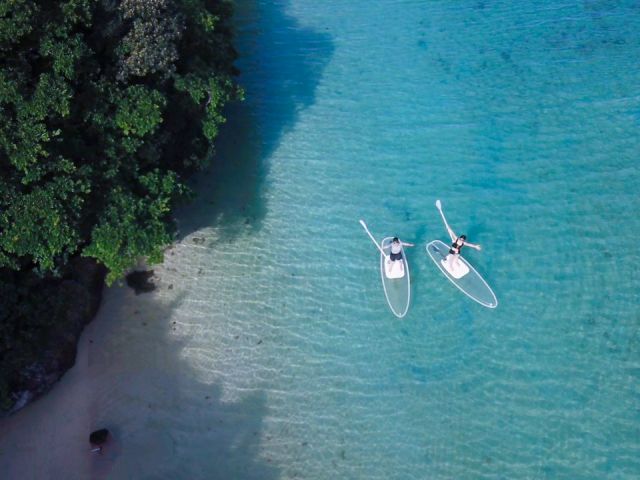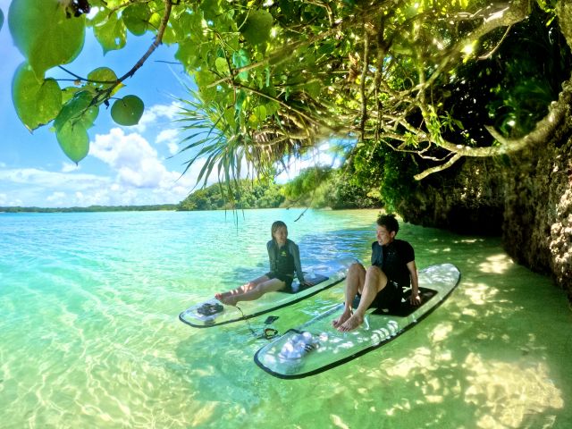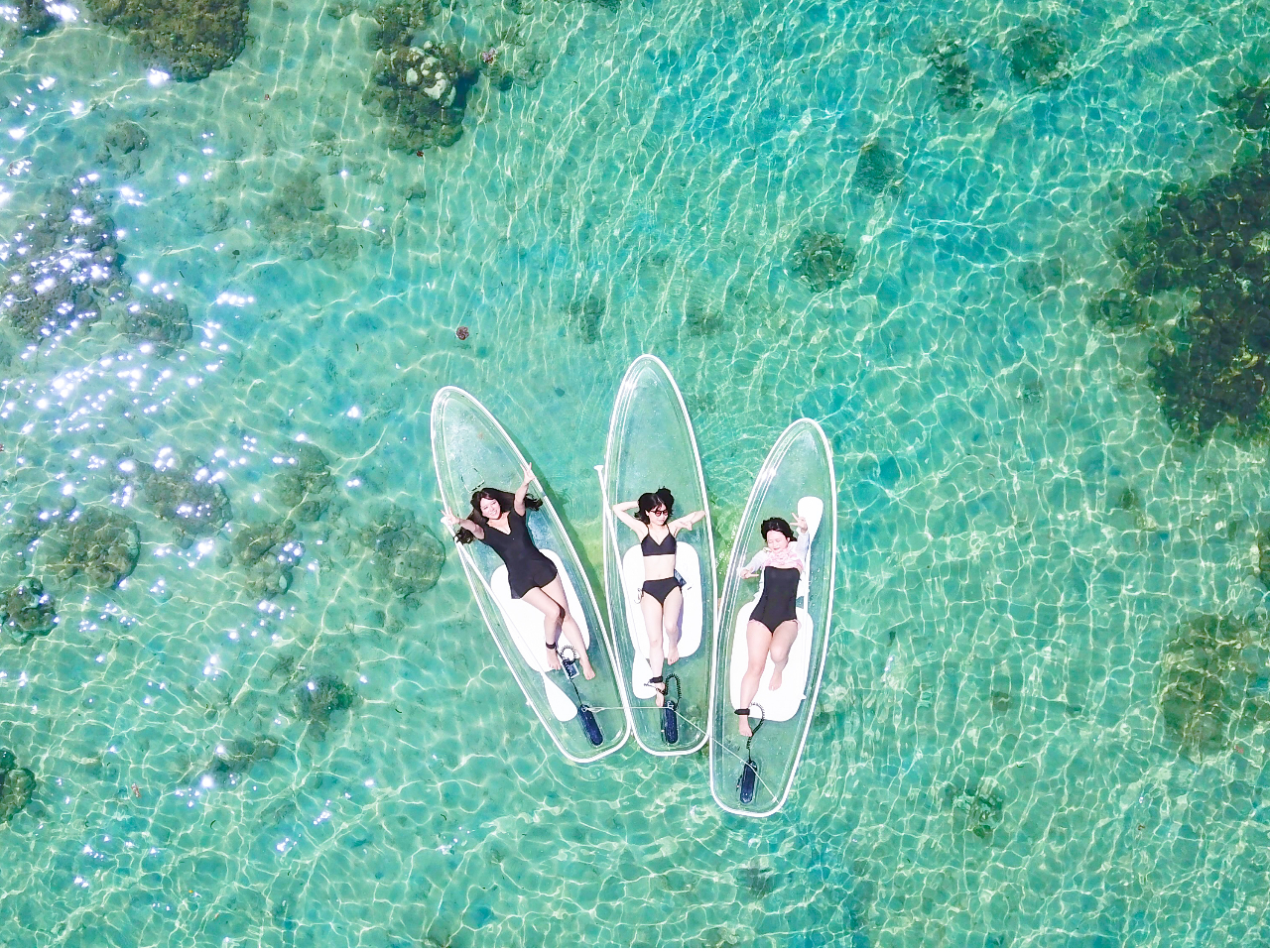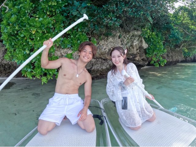 クリア素材のサップはなんだか海の上を飛んでるみたい!
