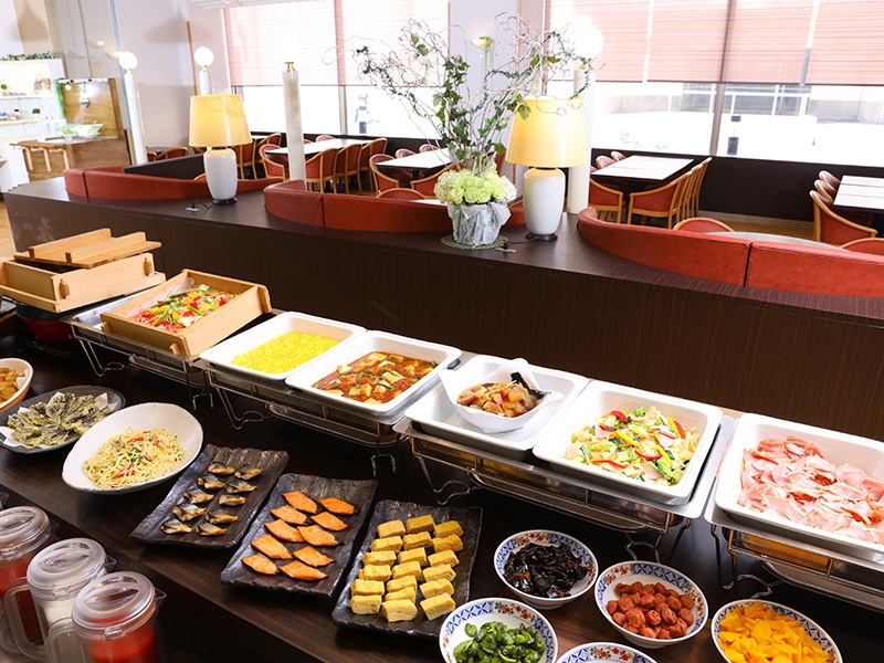 地元食材を使用した和洋ビュッフェを、温かみのあるレストラン店内でお楽しみいただけます。