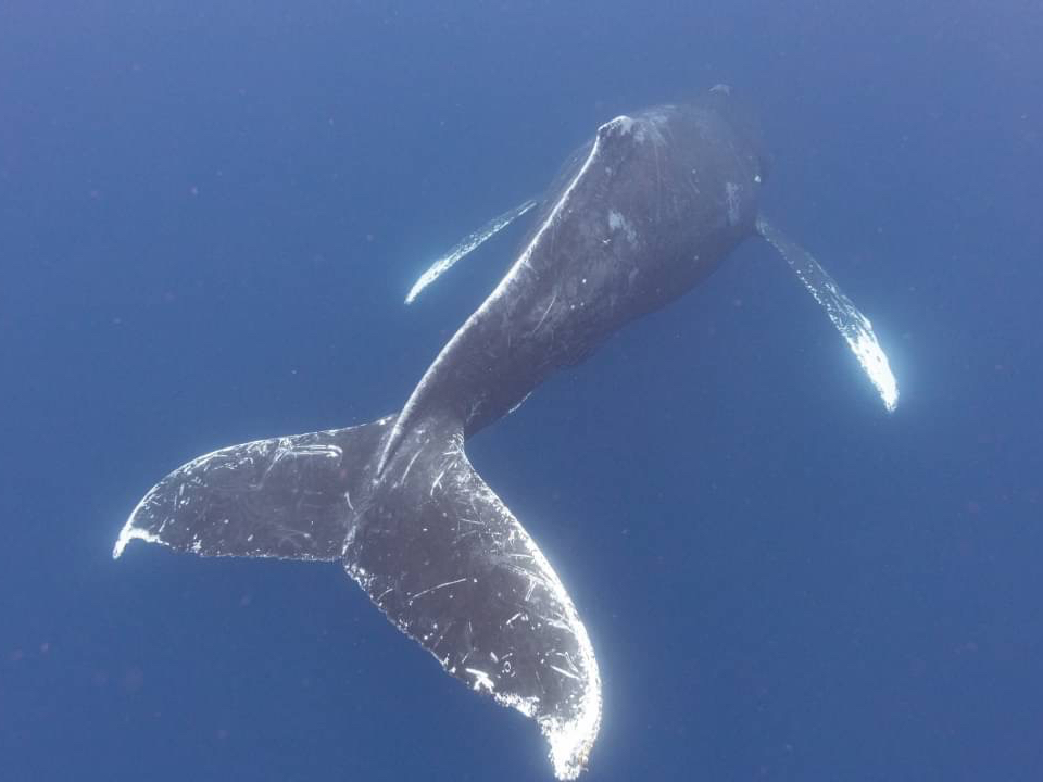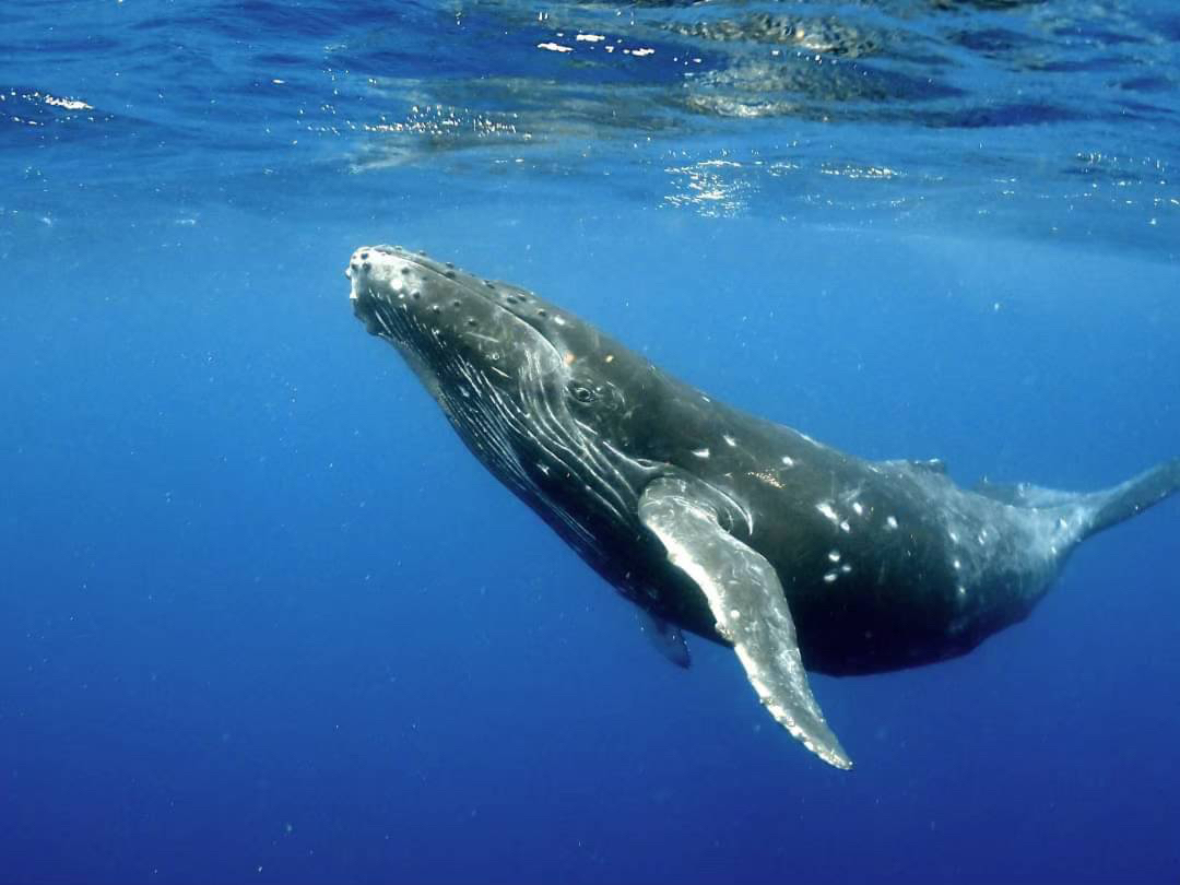 マスク、スノーケル、フィンの三点セットを使い、水面でクジラを観察することが出来ます。