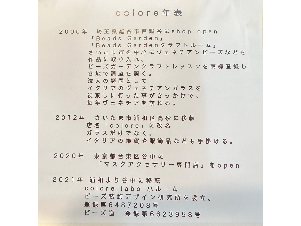 | 体験場所 | 〒110-0001 東京都台東区谷中5-6-11 森川ビル1階 ビーズ装飾デザイン研究所colore labo |