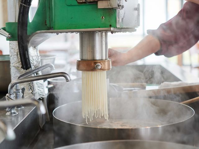 A生地を製麺機で押し出し、茹でます