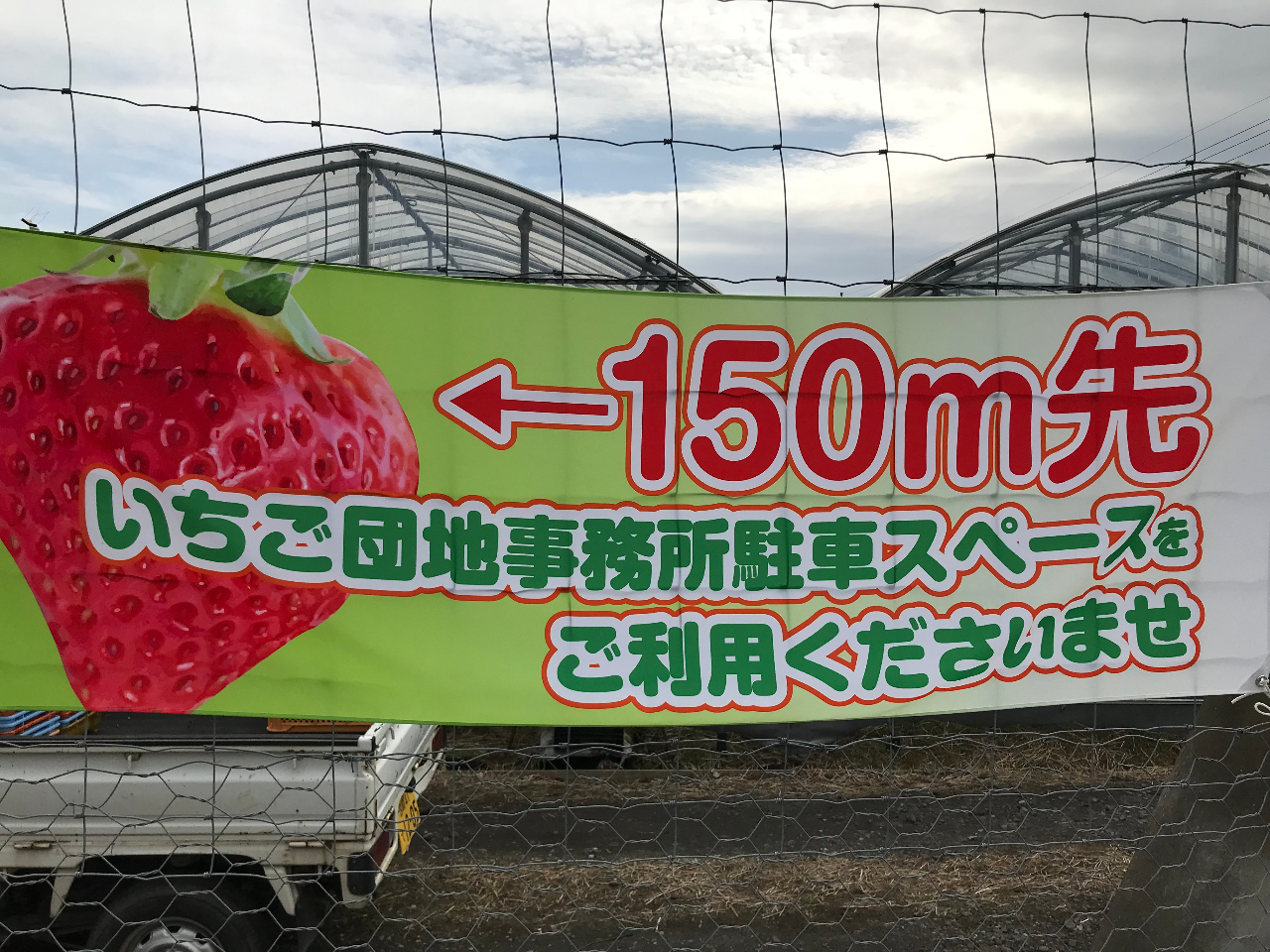 ビニールハウスに『いちご狩り』の横幕が張ってあります。