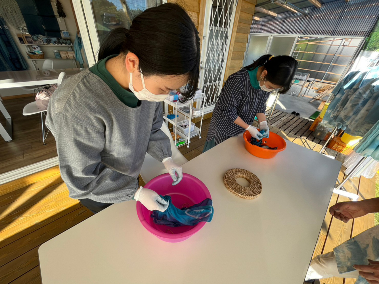 C ストールやTシャツを折りたたんだり縛ったりして藍染開始!