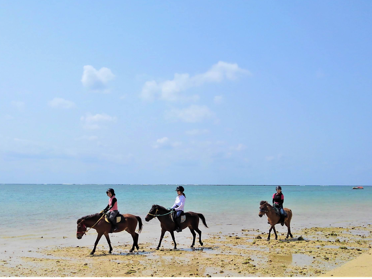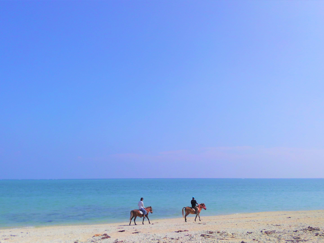 抜けるような青い空と白い砂浜を背景に、憧れのビーチ乗馬を。