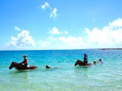 激レアな在来馬ヨナグニウマに乗って、南城市の青い海をスイスイ。シッポにつかまって泳ぐ体験も! 沖縄ならではの、馬と楽しむ新しいマリンスポーツです。