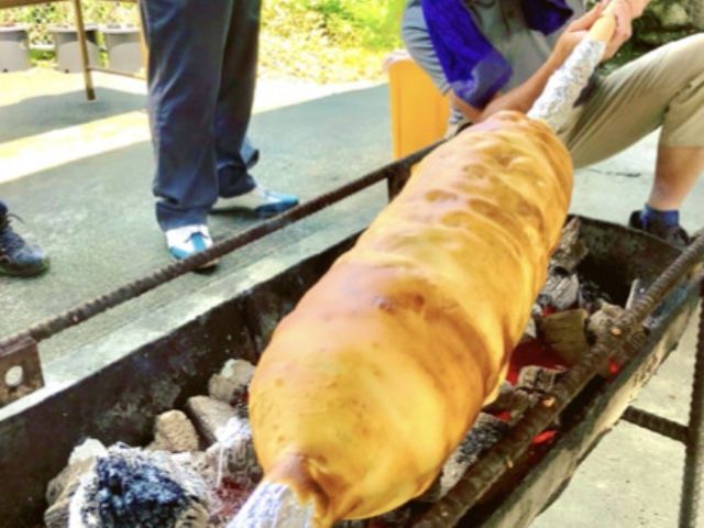 炭火の上でくるくる♪バームクーヘン作りはチームワークが試されます!