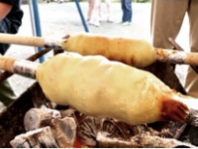 炭の上でくるくるくるくる。木の棒を回してじっくり焼き上げます。