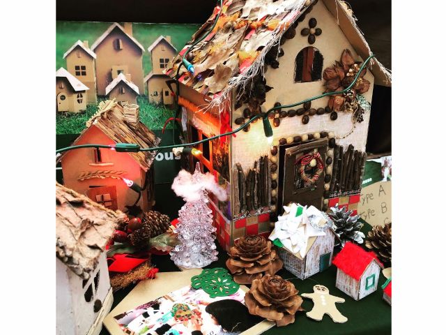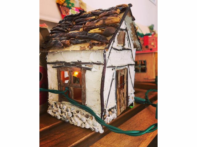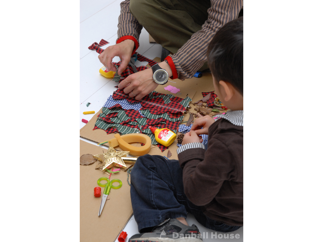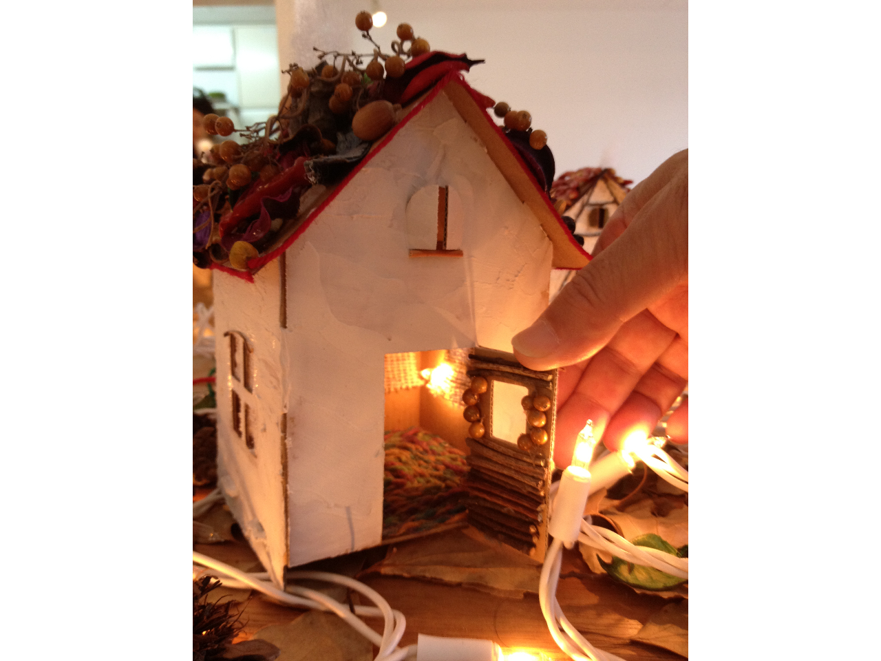 誰でも簡単に組み立てられるダンボール製のミニチュアハウスに、どんぐりや葉っぱなど自然素材のほか、かわいい包装紙や使い残しの毛糸・着なくなった洋服のボタンなどを貼り付けたり、クレヨンで色をぬったりして、自分だけの小さなお家を作れます。
