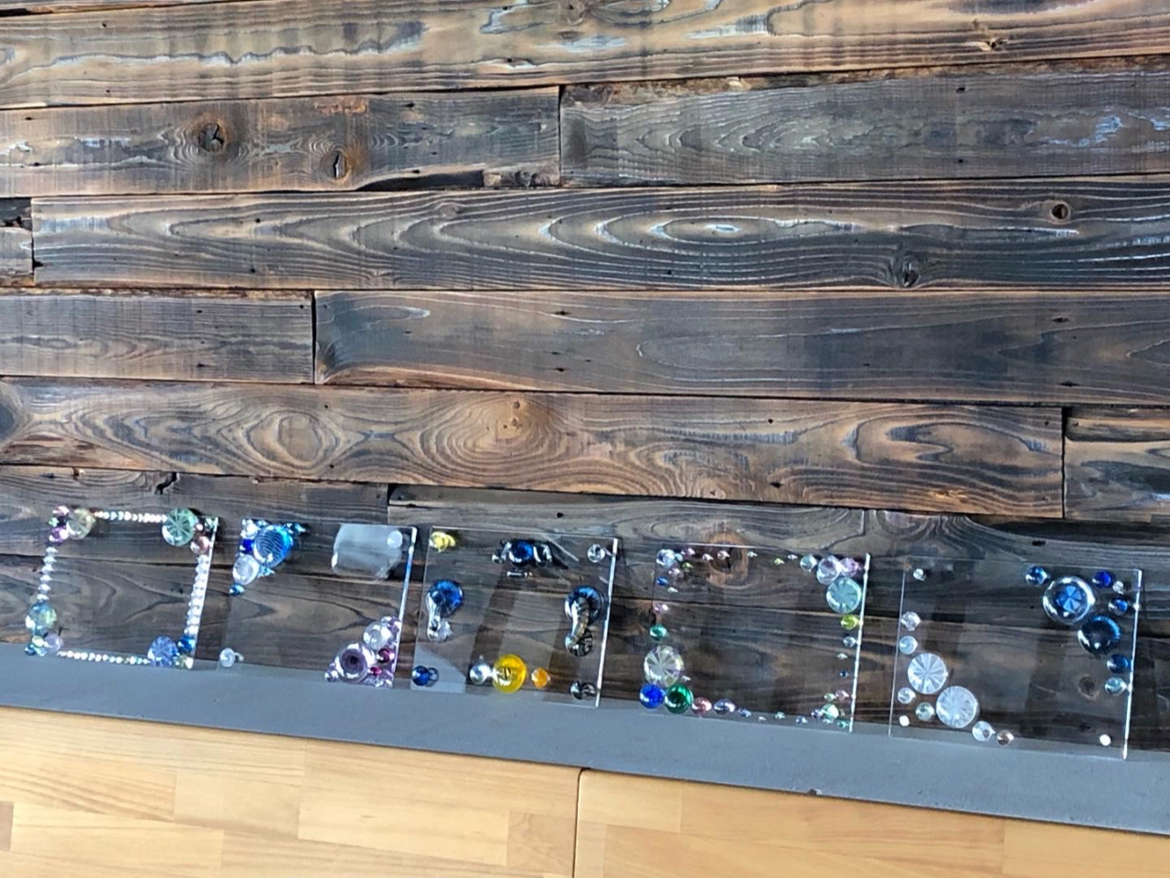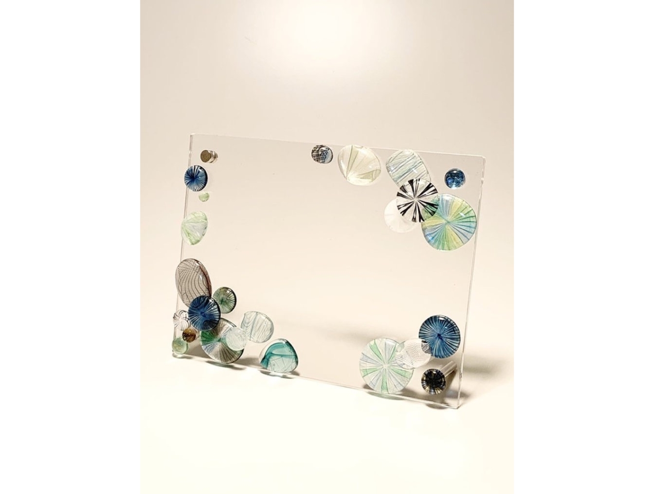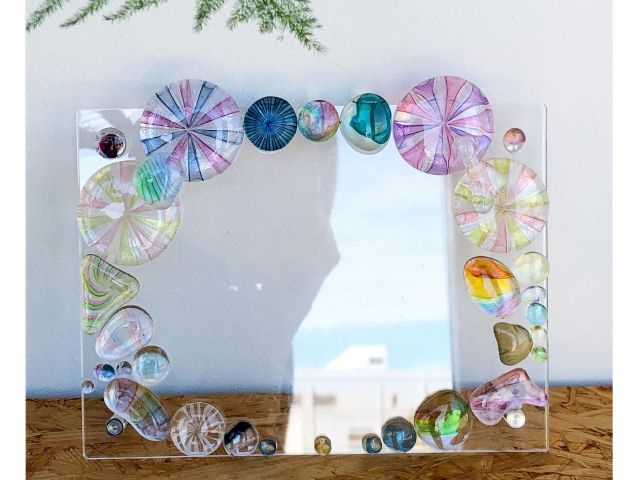 アクリルの板に、ガラスのパーツを貼り付けて制作していきます。