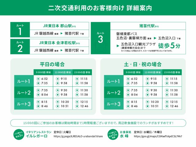 | 集合場所 | 〒969-2751 福島県耶麻郡猪苗代町若宮吾妻山甲2998−713 【駐車場】ゴーリトリート会津|GoRETREAT AIZU |