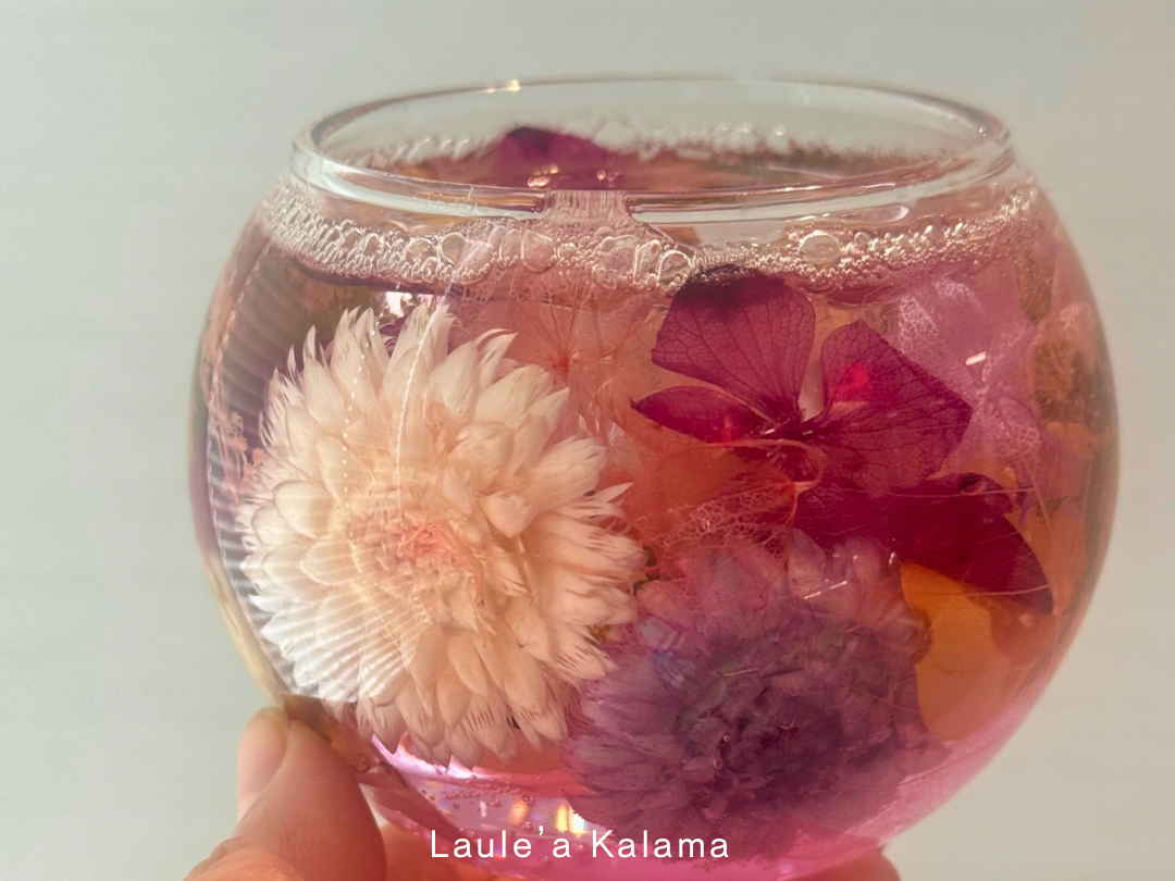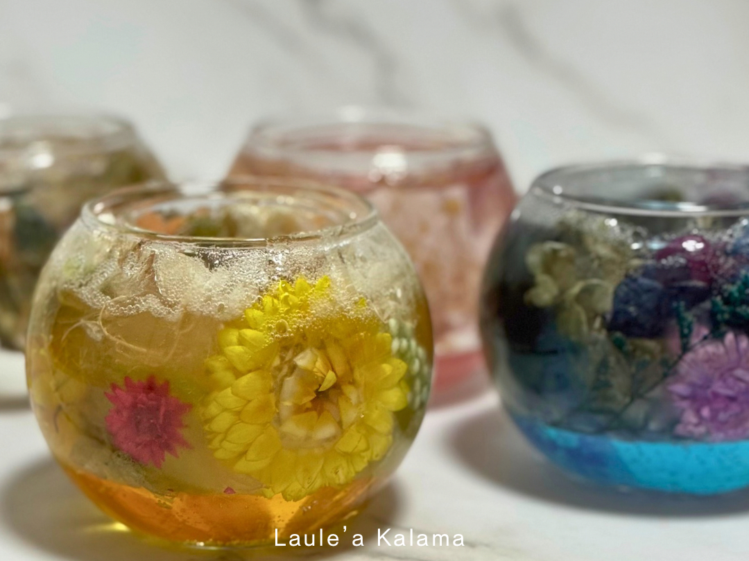好きなお花(ブリザーブドフラワー等)を詰め込んだボタニカルジェルランタンと、お好みの香りのティーライトキャンドルがお作りいただけます。