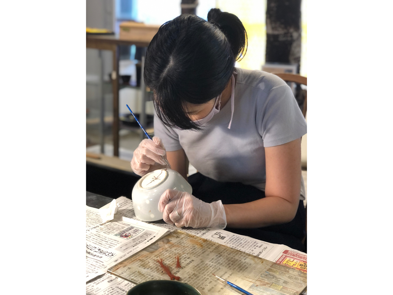親子で金継ぎ。お母さんは割れた器の側面に金粉をつけて箸置きに。