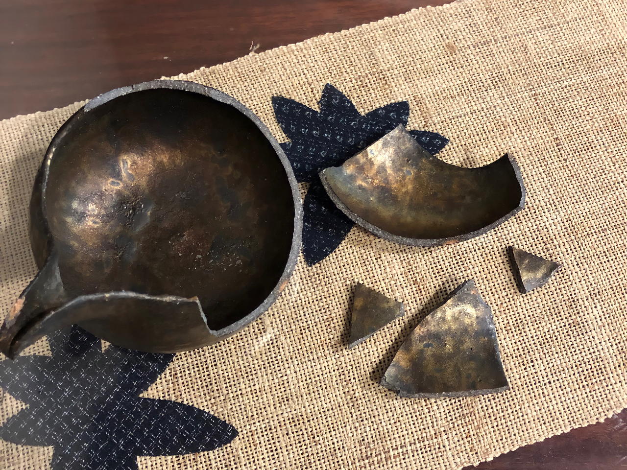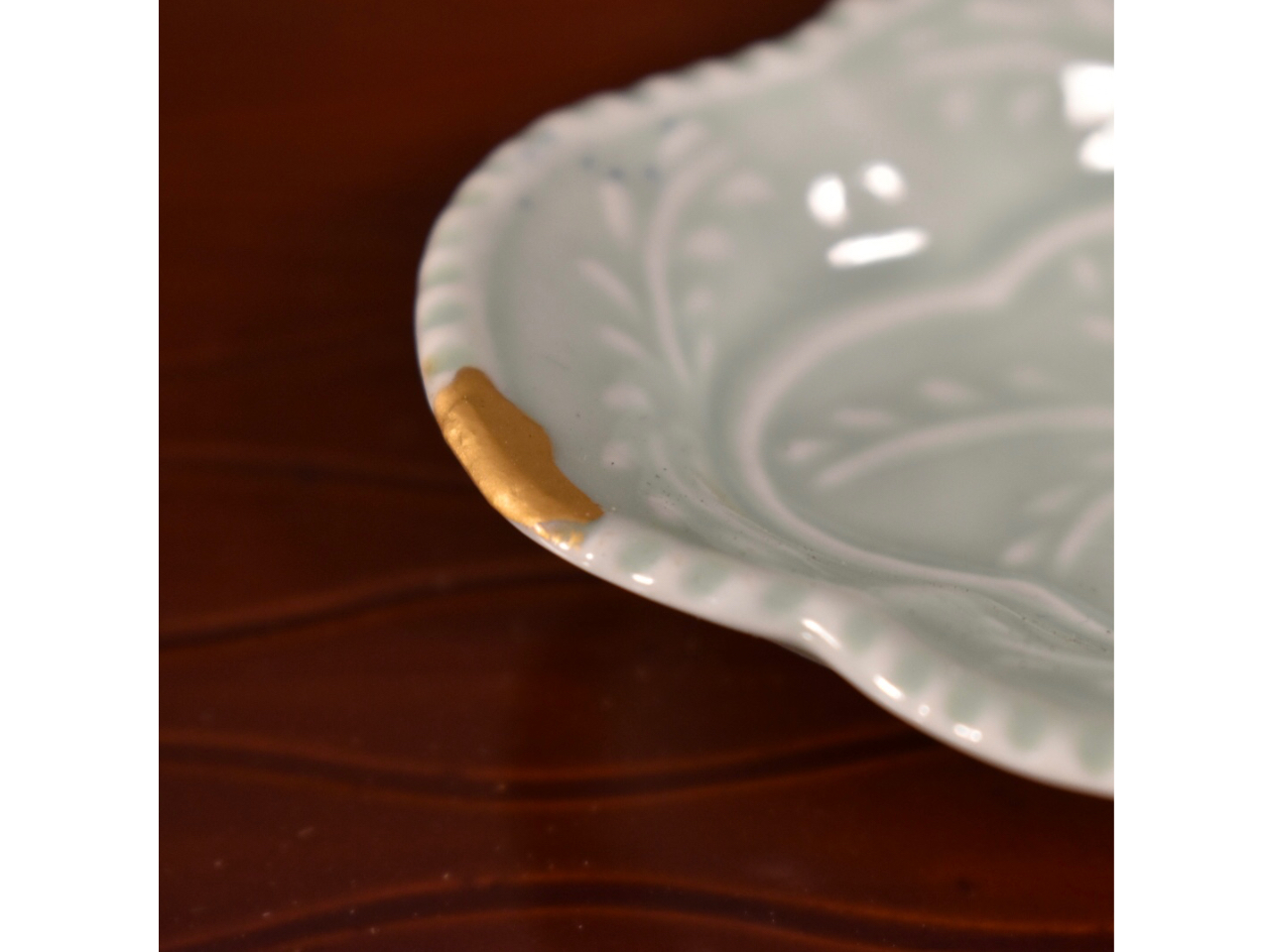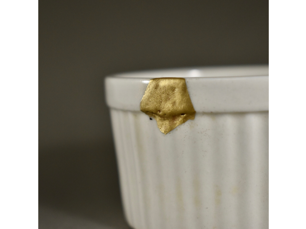 欠けや割れを漆でないもので補填して仕上げの粉の接着で漆を使用するモダン金継ぎ。