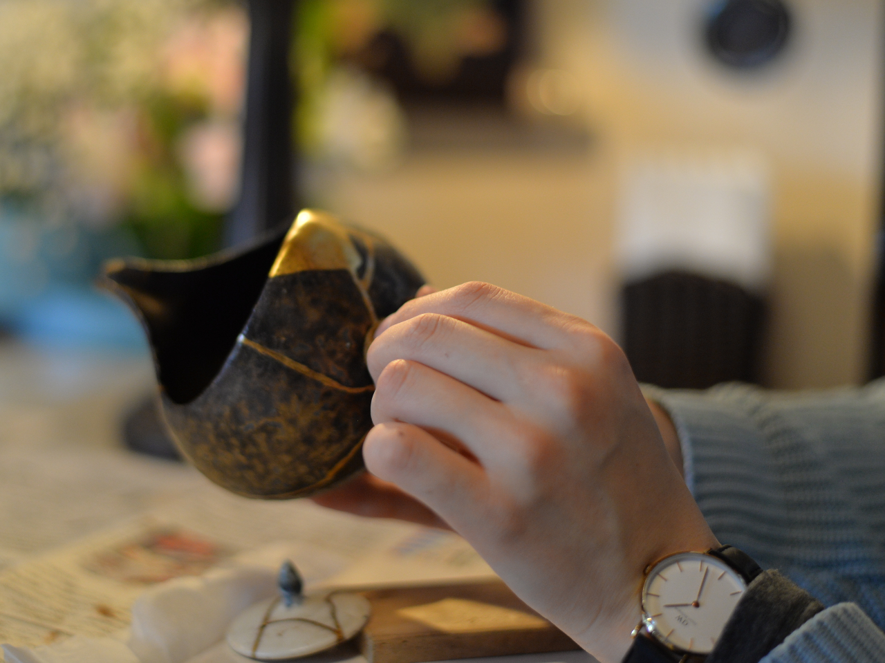 お二人で各々直す器を持ってきて一緒に金継ぎしました。