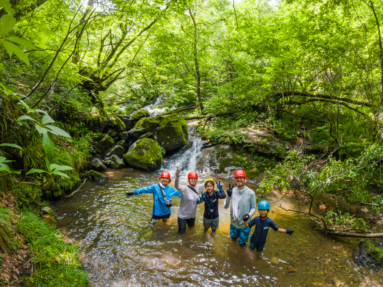 小学2年生と5年生、40代の運動不足夫婦の4人で参加しました。全員沢登りは初めてでした。少しドキドキしながら始まりましたが、水の冷たさに驚きながらも色とりどりの石や岩、鮮やかな緑色の世界での冒険にあっという間に夢中になりました。どの岩を踏んでいこう?どのルートで行こう?ここは手も使ってみようか、と、自然の中での体験に頭も体もフル回転。子どもたちのバッタやサワガニ探しにも付き合っていただきありがとうございました。