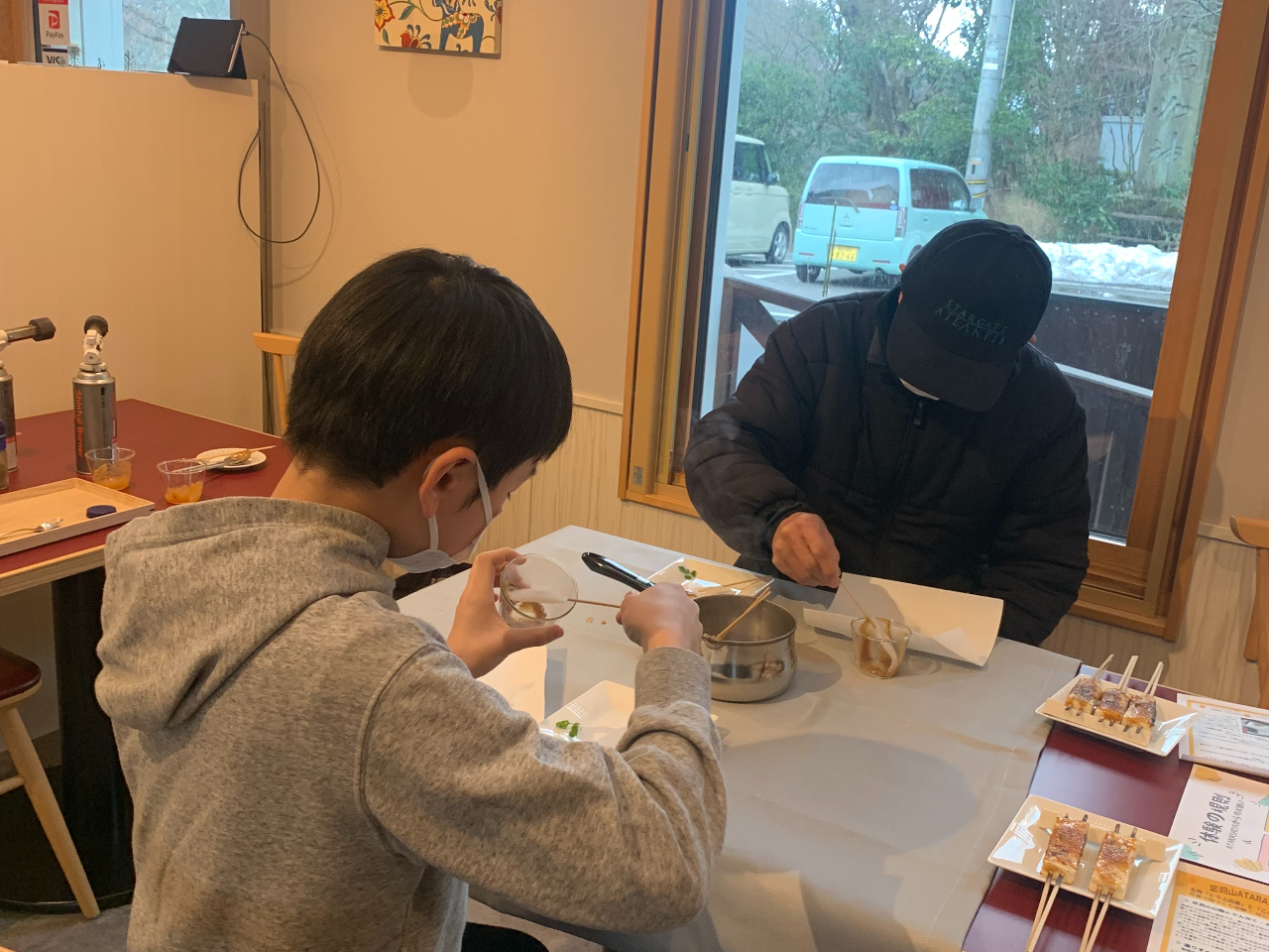 小学生のお孫さんとお祖父ちゃんがご来店。こんにゃくおでんを真剣に作成中