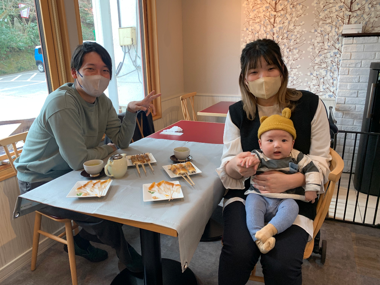 ヤングファミリーご来店です。でんがくにも辛子味噌を付けて焼くアレンジが好評!スウェーデンハウスの静かで温かい室内に,赤ちゃんもご機嫌!