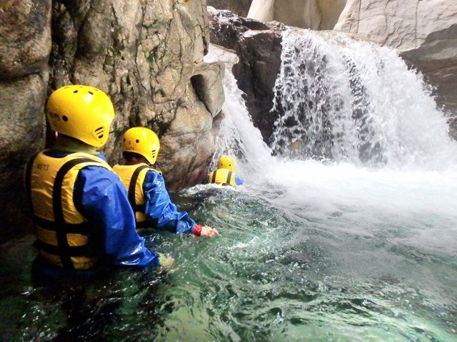 透明度バツグンの神崎川で、迫力ある滝のウォータースライダー、滝裏探検などドキドキの体験!