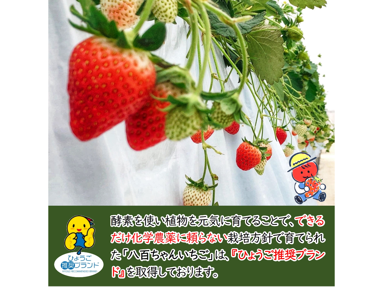 環境や健康に配慮した生産方法、優れた食感や品質・地域性のある素材で、かつ法令の遵守、生産管理体制などが整備された商品として八百ちゃんいちごが認証されました。
