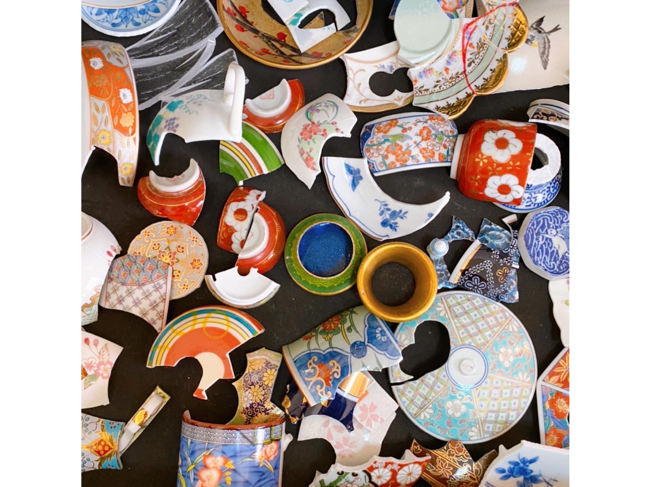 金継ぎと言う伝統的な技法と独自の接着法でモザイクの様につなぎ合わせた