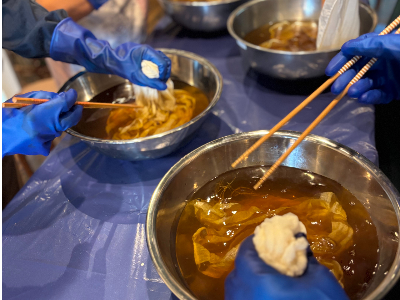 今回染めるのは、お弁当包みや贈り物にもぴったりな「ミニ風呂敷」。絞り染めの技法を用いて布を折り、結び、浸すことで、偶然と工夫が織りなす世界にひとつだけの模様が生まれます。開いた瞬間に現れる色と形は、まさに自然からの贈り物。アート作品のような仕上がりをお楽しみいただけます