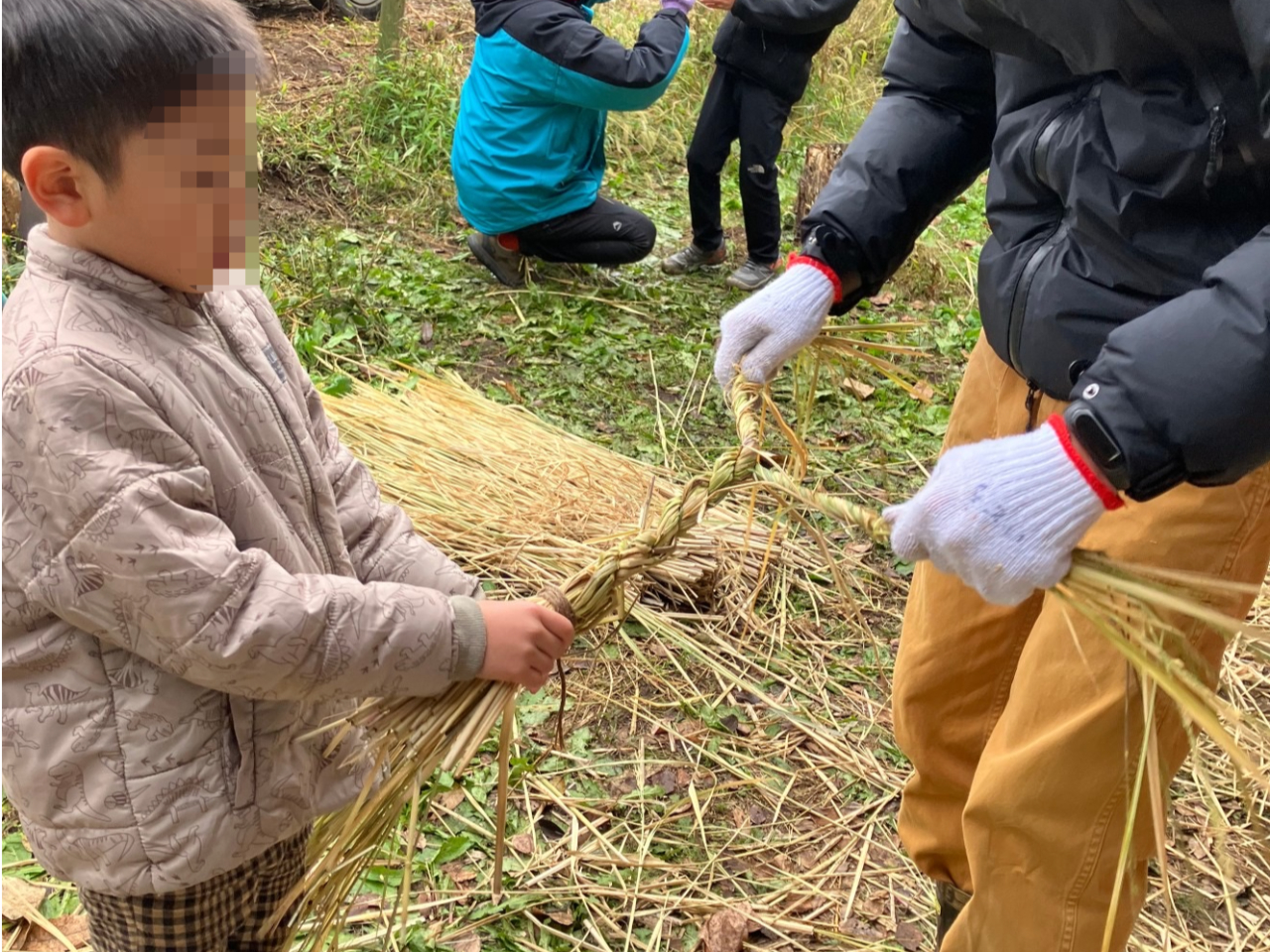 お腹が満たされた後は、当園で収穫した稲藁を使って「しめ縄づくり」へ。