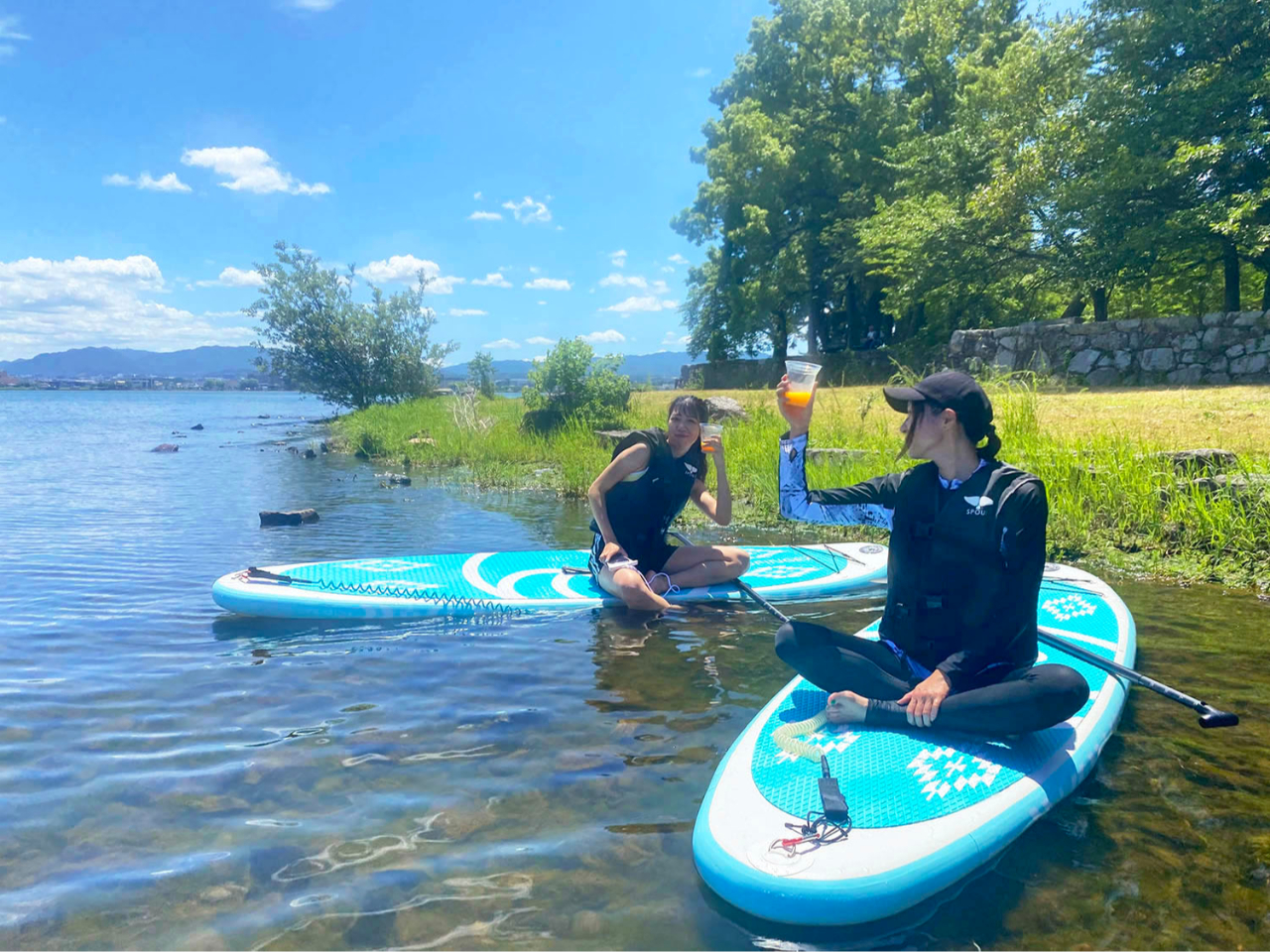 みんなで楽しくSUPをこいで、琵琶湖の真ん中、湖上休憩ポイントで約30分間琵琶湖のうんちくを聞いて知り、またSUP で帰ってくるワクワク体験!