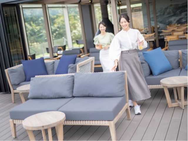シンボルの展望テラス&カフェでは、広々としたウッドデッキにソファやテーブルが並び、ゆったりとしたくつろぎの時間とおしゃれなカフェメニューをお楽しみいただけます。