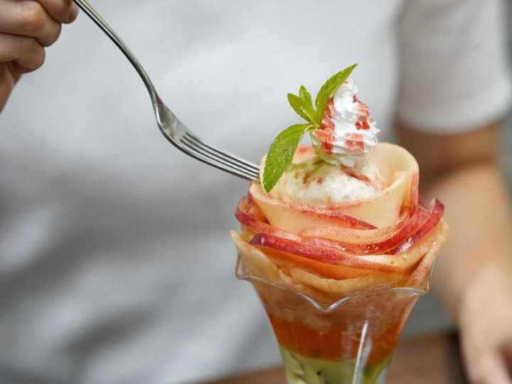 桃を薄く切り重ねながら飾り付けると…!バラの花ができますよ☆